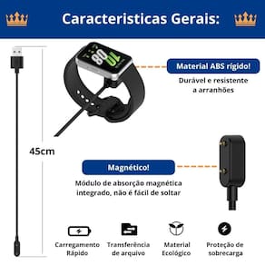 Cabo USB de carregamento com aproximadamente 45cm de comprimento. Possui porta USB para conexão a diversas fontes de energia. Suporta carregamento rápido e inclui medidas de segurança contra curto-circuito, superaquecimento e sobrecarga.Tipo