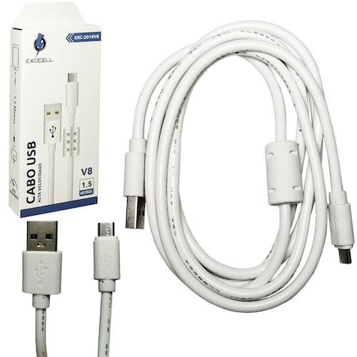 Cabo USB V8 turbo de 1,5 metros, ideal para carregamento rápido e transferência de dados. Material reforçado, flexível, resistente ao desgaste e tecnologia anti-nós.Tipo