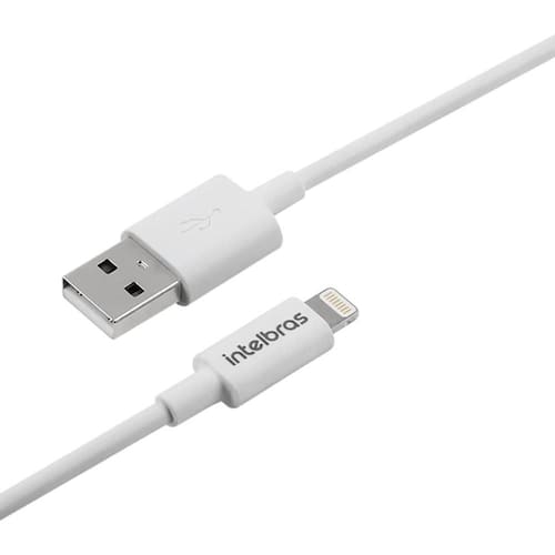 O Cabo USB Intelbras com conector tipo Lightning permite carregar e transferir dados em dispositivos compatíveis.