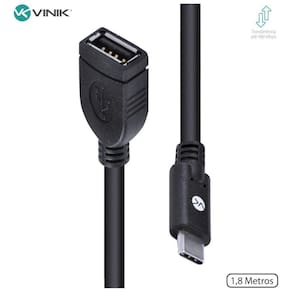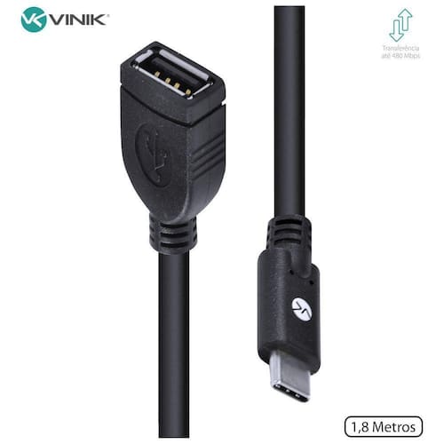 Padrão: USB Tipo C 2.0 Conectores: Tipo C x USB A fêmea Velocidade de transmissão: até 480 Mbps Voltagem: 5V Comprimento: 1,8 metros Cor: Preto Material do revestimento: PVC emborrachado Diâmetro: 5mm