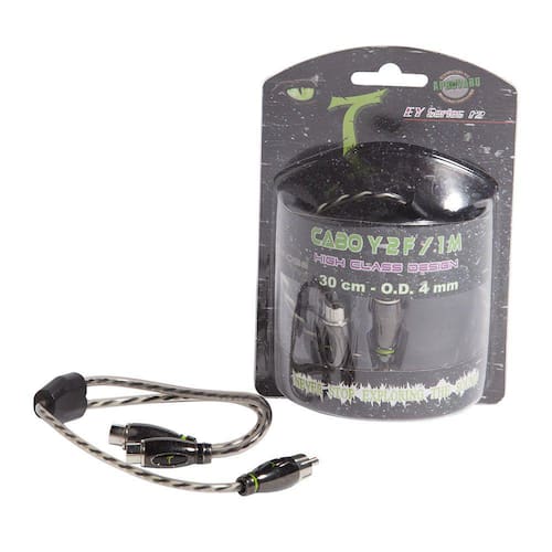 Aplicação: Sistema de áudio com conexão RCA Extensão do Cabo: 25 cm Canal: 2 FÊmeas/1 Macho Conectores: RCA - Metálico - banhado a niquel Formato: Reto Condutores: Fios de cobre livre de oxigÊnio - OFC Blindagem Interna 1: Fios trançados com tecnologia CAT-5 Blindagem Interna 2: Folha de aluminio Revestimento Interno: Camada em PVC Cor: Preto fosco translúcido Trança de Nylon: Proteção Conectores: Possui cavidades de alta pressão Cabo: Estrutura resistente Fácil Instalação: Por ser um cabo único e obter em suas extremidades uma junção que divide o cabo em 2 terminais RCA