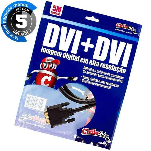 Cabos Dvi Para Dvi, 5 Mt Cirilo Cabos - Kit 5 Deseja conectar sua placa de vídeo em Monitores LCD ou Projetores digitais Esse Cabo DVI-D para DVI-D Dual Link de 25 pinos com 5 metros é a solução ideal, ele oferece pontas banhadas em ouro com uma excelente transmissão de imagem, sem qualquer interferência, transmitindo em resolução de até 2560 x 1600 a 60 quadros por segundo. - Imagem em alta resolução Digital HD - Conectores Banhados em Ouro - DVD-D 25 Pinos Dual Link - Resistente Especificações Técnicas: Conectores:0 - DVI-D para DVI-D - Macho - 25 Pinos - Parafusos laterais para melhor fixação Resolução: Até 25601600 a 60fps Pontas: Banhadas em Ouro Comprimento do cabo: 5 metros Cor: Preto Acompanha: 05 - Cabos DVI para DVI Macho Cirilo Cabos - 5 metros Peso Individual: 380g Peso do kit: 1,9 kg Garantia: 3 meses Atenção: Cabo DVI para DVI não transmite áudio. Verifique a compatibilidade com seu equipamento antes da compra, não nos responsabilizamos por incompatibilidades.