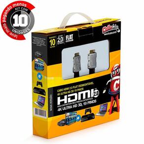 Cabos hdmi 2.0 flat desmontável - 10 mts kit com 10 O cabo hdmi 2.0 flat desmontável,19 pinos, 4k, ultra hd, 3doferece qualidade em som e imagem de cinema. Conta com pontas desmontáveis o que facilita a passagem por conduites até . Também é compatível com todas as mídias hdmi. Ideal para vídeo games, televisores e projetores. Passe seu cabo por conduites e organize seu sistema de som e imagem. Utilize todos os benefícios dos seus dispositivos ip sem a necessidade de cabos de rede ethernet. Cabo hdmi 2.0 flat desmontável,19 pinos, 4k, ultra hd, 3d de 10 metrosfácil instalação: ponta desmontável que facilita a passagem por tubulaçõese conduites de 3/4. Os cabos flat desmontáveis da cirilo cabos oferecemuma maior maneabilidade na hora da instalação, é indicado para espaçospequenos podendo ser dobrado sem prejudicar a qualidade de som e imagem.Especificações: Tamanho:10 metros. Compatibilidade:2.0 / 1.4 / 1.3b e todos os padrões hdmi anteriores Resolução de vídeo:576i, 576p, 720i, 720p, 1080p e 2160 - 4k60hz. Velocidade de transmissão:alta taxa de transferência: 18 gbps/s à 600mhz. Retorno de áudio 7.1:permite transmitir o áudio sem a necessidade de passar um cabo a parte. Imagens:compatível com todos os formatos atuais de 3d. Utilização:modelos como hdtv, home theater, vídeos games ps3, ps4, xbox, projetores,televisores lcd, led, dvd, box, telões, blue-ray, entre outrosaparelhos com hdmi. Conectores:banhados a ouro 24k. :3 meses Conteúdo da embalagem:1 cabo hdmi 2.0 - 19 pinos Homologação Anatel: 009931705867