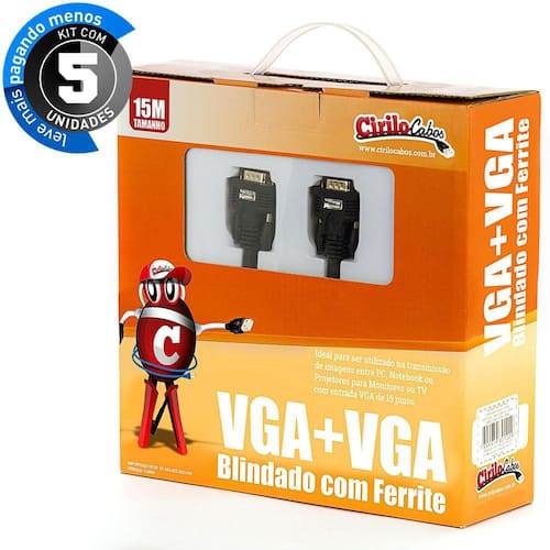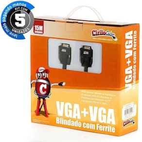 Cabos Vga Blindado - 15 Mt Cirilo Cabos - Kit 5 Imagine só... Você tem um PC numa ponta da sala e um projetor na outra ponta. A Cirilo Cabos tem a solução: Apresentamos o Cabo VGA + VGA com 15 Metros de comprimento. A metragem certa pra você fazer a ponte entre esses dois periféricos ou qualquer outro que use VGA nas duas pontas , sem precisar jogar o cabo no caminho.O cabo é ideal para fazer a transmissão de dados entre PCs, Notebooks e Projetores com entrada VGA de 15 pinos. Com trava para segurar o cabo conectado, dupla blindagem e filtro de ferrite, oferece muito mais segurança na transmissão.O cabo VGA + VGA blindado + Ferrite é importando da China com a qualidade Cirilo Cabos.Características Gerais:Entrada/Saída: VGA Macho Blidagem: Dupla Filtro: Ferrite Garantia: 3 meses Comprimento do cabo: 15 metros Cor: Preto Conteúdo da embalagem: 1 Cabo VGA+VGA de 05 metrosCiriloCabos, cabo vga para ligar projetor, cabo vga para projetor, vga para vga, cabo vga, cabo vga blindado com ferrite, cabo vga blindado rolo, cabo vga blindado 15 metros.