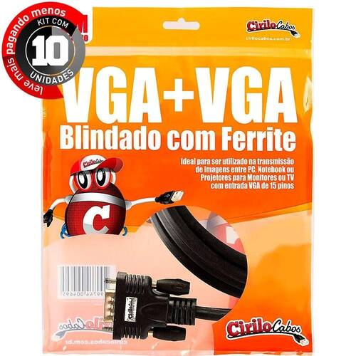 Cabos vga blindado - 5 mt cirilo cabos - kit com 10 a cirilo cabos traz até você o kit com 10 unidades do cabo vga + vga blindado com ferrite. Ideal para ser utilizado em laboratórios de informática, salas de reuniões, monitores em elevadores, ligar sua tv ao pc/notebook ou onde mais você precisar com entrada e saída vga. A blindagem + ferrite, oferece mais segurança ao cabo evitando interferencias. Mas atenção: por ele trafega apenas a imagem. O áudio deve ter um cabo a parte. Veja as opções de cabos p2 que temos. Neste kit, o cabo vga + vga é oferecido com a metragem de 5 metros. Características gerais: tamanho do cabo: 5 metros modelo: cabo vga para vga blindado com ferrite resolução máxima:1080p conexões: vga macho x vga macho conteúdo da embalagem: 01 cabo vga+vga com ferrite