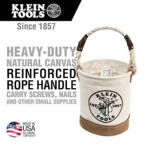 Klein Tools Mini balde de ferramentas 5104MINI, balde de ferramentas multiuso com fundo de couro, porcas e saco de parafuso com alça de corda reforçada, bolsa pequena para utilidades - A mini bolsa de ferramentas é feita com lona natural resistente e possui um fundo reforçado com couro para maior resistência - O tamanho compacto garante o transporte conveniente de pequenos suprimentos no local de trabalho, no escritório ou no seu carro - A parte inferior robusta garante estabilidade, tornando-a ideal para pequenas ferramentas e armazenamento de suprimentos em um balcão ou mesa - Bolsa utilitária leve para fixadores, ferramentas e outros pequenos suprimentos - Alça durável feita de corda reforçada para uma aderência resistente e transporte confortável - Tamanho ideal para pequenas ferramentas e peças com 15 cm de altura e 10 cm de diâmetro - O fundo estável o torna perfeito para usar em um balcão ou mesa para organizar pequenas ferramentas e outros suprimentos