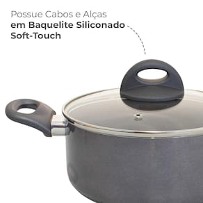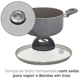 O Cabo é em baquelite siliconado soft-touch, o que evitará que esquente durante o preparo de seus alimentos, e a tampa é feita de vidro temperado com saída para vapor e borda em inox, ideal para você que gosta de sofisticação e elegância em sua cozinha.