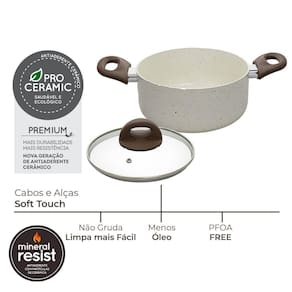 É produzida em alumínio com revestimento em cerâmica, ambos na cor vanilla com a tecnologia Pro Ceramic com classificação A do Inmetro, não grudam, são mais fáceis de limpar e mais saudáveis, pois necessitam de menos óleo para o cozimento e são livres de metais pesados.