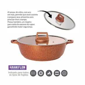 Instruções para o uso correto da linha Moda do Chef Graniflon:Cura das panelas:1 – Antes do primeiro uso, unte a superfície interna com óleo/gordura e aqueça-a em fogo alto por 2 a 3 minutos. Após, desligue o fogo e espere esfriar. Repita essa operação sempre que desejar um melhor desempenho antiaderente.2 - Após esfriar, lave-a com esponja macia e detergente neutro em água morna. Enxágue para proteger o revestimento.3- A sua panela está pronta pra uso, repita esse processo pelo menos a cada três meses para proteger o revestimento. Recomendações:Para um melhor desempenho e durabilidade do antiaderente, use sempre um fio de óleo ou azeite.Nunca usa uma chama muito alta e forte, pois pode danificar a pinturaUse sempre utensílios de silicone, nylon ou madeira, para não danificar a pintura.Nunca deixe a panela vazia (sem alimentos) sobre uma fonte de calor por mais de 1 minuto, isso pode danificar o revestimento.Para a limpeza, sempre use sabão neutro e esponja não abrasiva. Utilize água quente e bicarbonato de sódio para remição de odores e resíduos mais persistentes. Informações técnicas:Ref.: MC0134Material: revestimento antiaderente premium GraniflonPeso (KG): 1,41kgLxA: 28x7cmCapacidade: 2,5LCor: LaranjaMarca: Moda do ChefFabricante: Marcamix - Utilidades Gourmet