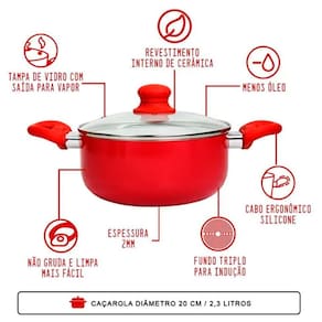 Caçarola Cerâmica Red 20cm Fundo de Indução Tampa de Vidro As caçarolas possuem boa profundidade com paredes laterais altas, tampa e 2 alças para manuseio, por esses motivos são ideais para o preparo de cozidos e ensopados, mas podem ser utilizadas de diversas formas nas suas receitas do dia a dia ou em preparações especiais. Pode usar em fogões elétrico , a Gás, vitrocerâmico , halogêneo e indução. Pode ir na maquina lava- louca. Pratica, funcional e mais saudável não macha e não risca com facilidade, dissipa o calor para o cozimento uniforme, reduz a qualidade de óleos e gordura, prepara mais rápido e consume menos energia e, fácil de limpar, não gruda e não queima os alimentos.