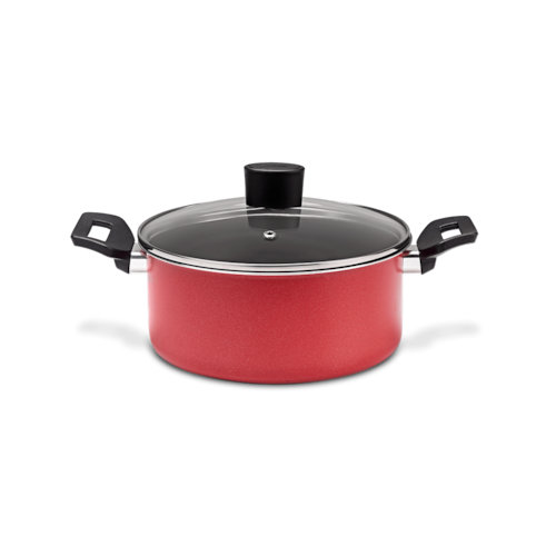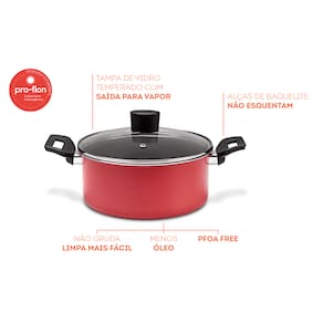Prática e segura, a caçarola da linha Garlic, de 20x9cm com capacidade de 2,5 litros, tem estrutura de alumínio que dissipa melhor o calor cozinhando o alimento por igual e mais rapidamente. Já o revestimento interno antiaderente não deixa o alimento grudar mesmo com uso reduzido de óleo. O material também facilita a limpeza. A tampa é de vidro temperado e possui saída para o vapor. Com cabos de braquelite, material que não aquece, o manuseio do utensílio fica mais fácil e seguro. A pintura externa é vermelho. O ciclo de vida do produto pode variar conforme frequência e intensidade da utilização. O produto deve ser descartado (livre de materiais orgânicos) em coletores de resíduos seletivos. A logística reversa não é aplicável._x000D_