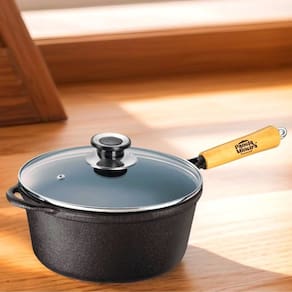 A Caçarola Emily Cabo de Madeira e Tampa de Vidro da Panela Mineira possui um design aperfeiçoado, fundo reto preto, bordas alongadas e tampa moderna. Com excelente distribuição e retenção de calor característico do ferro fundido, esse produto se torna ideal para assar, grelhar, fritar e cozinhar. Seu formato redondo é muito utilizado para o preparo de arroz, bife, frango, feijão, carnes e legumes, cozinhando os alimentos uniformemente, de maneira lenta e com muita maciez, o que garante ainda mais sabor e qualidade às receitas.
