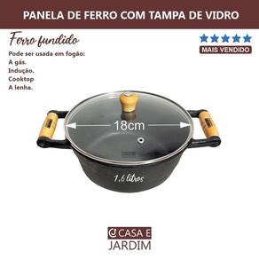 Caçarola Ferro Alça Madeira Vidro 18cm Casa 1,6L