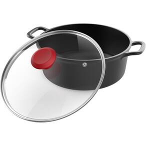 1 Caçarola de Alumínio de 24cm; 1 Tampa de Vidro de 24cm Pomel Vermelho; 1 Manual de Instrução.