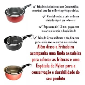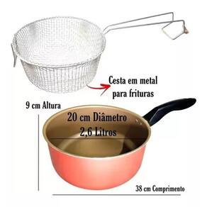 Prazer, somos a Mandacaru & Varejo Nossa missão é garantir a satisfação total dos nossos clientes, entregando produtos de qualidade e excelência no atendimento.Assim estabelecendo uma relação de confiança, oferecendo a você, a melhor experiência de compra!Para garantir sua melhor experiência, recomendamos que leia completamente a oferta e as descrições do produto pretendido, e caso tenha alguma dúvida utilize o campo de perguntas para que nossa equipe possa lhe auxiliar. Nossa equipe de pós venda está à disposição para te auxiliar e esclarecer eventuais dúvidas.Agradecemos a sua visita e aguardamos seu pedido! Caçarola Fritadeira Antiaderente com Cesta Removível, uma das melhores opções para Fritar de tudo! Isso porque este material conduz o calor de forma eficiente e igual por toda a forma, o que faz com que a fritura fique uniforme e não fique com partes mais secas e outras mais úmidas. Produzida com alumínio antiaderente de alta qualidade, espessura de 1,2 mm, peças com maior resistência e durabilidade, alumínio que distribui melhor o calor, proporcionando um cozimento mais rápido e uniforme do alimento. Além disso o conjunto acompanha uma linda Espátula de Nylon para a conservação do produto, que não passa o calor, contribuindo para um manuseio mais confortável e seguro.Especificações Técnicas:Dimensões aproximadas - cm: (A x L x C):- 1 Fritadeira com Cesta 20cm diâmetro – 9 x 21 x 38 (2,6 Litros)- 1 Espátula Nylon Material Fritadeira: Alumínio Antiaderente TeflonMateria Espátula: NylonEspessura Material: 1,2 mmPeso: 230 gPeso Embalagem: 170 gEmbalagem: Saco Plástico / Caixa PardaDimensões aproximadas da embalagem (AxLxP): 7 x 25 x 28 cmCuidados:- Ideal para fogão a gás, elétrico e vitrocerâmico com resistência elétrica;- Para mexer os alimentos use somente utensílios de silicone ou nylon;- Nunca use utensílios de metal ou objetos pontiagudos;- Mantenha o produto sobre o fogão ou fonte de calor, apenas o necessário para o cozimento, sempre em fogo baixo ou médio (nunca superior a 350°C);;- Não pode ser levada ao microondas;- Evite a imersão do produto quente em água fria. Sempre o deixe esfriar antes de lavar;- Para limpeza, utilize sabão ou detergente neutro e esponja macia;- Nunca utilize solventes, objetos cortantes ou abrasivos;- Para maior durabilidade do produto recomenda-se secar bem antes de guardar.Informações do Fabricante: A Coisas&Trecos possui 18 anos de experiência no mercado de alumínio, entregando produtos com qualidade aos clientes. Garantia do fornecedor: 30 dias contra defeitos de fabricação.Estamos à disposição para qualquer dúvida.