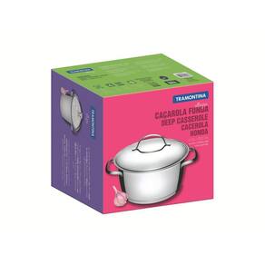 Caçarola Funda Tramontina Allegra em Aço Inox com Fundo Triplo e Tampa de Vidro 22 cm 4,2 L Você vai se impressionar com a Caçarola Funda Tramontina Allegra em Aço Inox com Fundo Triplo e Tampa de Vidro 22 cm de diâmetro 4,2 L. Produzida em aço inox com acabamento alto brilho e fundo triplo (aço inox + alumínio + aço inox), ela distribui o calor uniformemente, proporcionando um cozimento mais rápido e uniforme, economizando energia e deixando os alimentos aquecidos por mais tempo. É uma caçarola perfeita para ter sempre por perto, que possui tampa de vidro com saída de vapor e encaixe perfeito, e que pode ser ainda lavada diariamente na máquina de lavar louças e pode ser utilizada em diversos tipos de fogões. Os itens da linha Allegra vão transformar sua cozinha! Mais saudável: por ser feita de aço inoxidável, a caçarola Tramontina não libera nenhum tipo de resíduo nas suas receitas. Fácil de usar: uma caçarola prática para todas as suas receitas e que faz bonito em qualquer tipo de fogão: gás, elétrico, vitrocerâmico e indução. Tampa de vidro com saída de vapor e encaixe perfeito. Mais durável: o inox Tramontina é uma matéria-prima nobre, resistente e que vai fazer bonito por muito mais tempo na cozinha. Economiza tempo e energia: o segredo está no fundo triplo (aço inox + alumínio + aço inox), que distribui o calor uniformemente, proporcionando um cozimento mais rápido. Por isso, você pode manter o fogo baixo durante todo o preparo e, assim, poupar energia. Fácil de limpar: deixar sua caçarola brilhando é simples, você só precisa de água, sabão e uma esponja macia. Se preferir, é só colocar na máquina de lavar. Cuidados com o produto A capacidade volumétrica máxima para cozimento é de 3/4 da capacidade total da peça.Antes de utilizar o produto, remover as eventuais etiquetas e lavar com água quente e detergente. Use uma fonte de calor brando para evitar que o alimento grude no fundo da caçarola. O fundo triplo distribui uniformemente o calor, não sendo necessário o fogo alto. E, além disso, você economiza energia. Quando a caçarola for utilizada no fogão a gás, a chama não deve ultrapassar a base da caçarola. No caso de uso de chapa elétrica, a chapa deverá ter diâmetro igual ou inferior ao da caçarola. Sempre dissolva o sal em água fervendo ou com os alimentos, mexendo os ingredientes no início do cozimento. Não aqueça o alimento colocando uma caçarola do mesmo diâmetro sobre a outra. Esse procedimento é perigoso, pois cria vácuo e impossibilita a retirada do mesma. Se a tampa da caçarola de aço inox Tramontina ficar presa pelo efeito do vácuo durante o resfriamento, basta puxar ou aquecer novamente até neutralizar o efeito do vácuo. As alças de inox aquecem durante o cozimento. Aconselhamos o uso de luvas durante o manuseio. Alguns alimentos que possuem amido, como massa e arroz, poderão deixar manchas na parte interna da caçarola durante o cozimento. Para remover facilmente as manchas, passe um pano umedecido com suco de limão ou vinagre, ou use a Pasta para Polir e Remover Manchas Tramontina. Evite deixar alimento na caçarola por muito tempo Garantia 90 dias de garantia legal para vícios ou defeitos de fabricação.