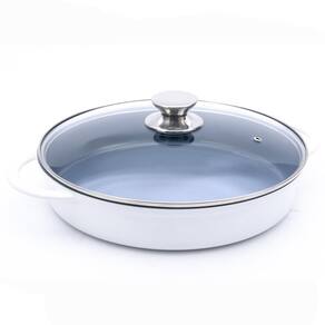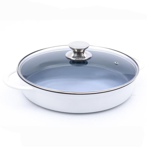 - Marca: Hercules - Capacidade: 3,5 Litros - Tamanho: 30x6cm - Cor: Branca - Corpo em alumínio fundido - Revestimento antiaderente cerâmico - Pintura resistente a altas temperaturas - Tampa de vidro - Pode ir ao forno e lava-louças - Fundo especial para todos os tipos de fogão fogão convencional a gás, indução e halogênio - Garantia: 3 meses