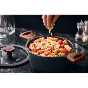 Se você busca por panelas que facilitam o seu dia a dia, resistentes e saudáveis, a Linha Titanium é perfeita Com a nova geração de antiaderente cerâmico: Cerâmic-Flon, as panelas são livres de metais pesados e elementos químicos prejudiciais à saúde, exigem menos uso de óleo, não deixam os alimentos grudarem e facilitam a limpeza. Os cabos e alças são revestidos com Soft-Touch, não esquentam e proporcionam um toque macio e confortável durante o uso. Possuem tampas de vidro temperado com saída para o vapor. Sua composição em alumínio injetado de 5mm de espessura, garante aquecimento uniforme e seu revestimento cerâmico marmorizado e assegura alta performance em antiaderência para o melhor desempenho durante o uso. Acabamento sofisticado, esse é pra surpreender os convidados, hein