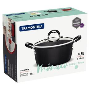 A caçarola Tramontina Mônaco Induction em alumínio com revestimento interno e externo antiaderente Starflon Premium preto com tampa de vidro 24 centímetros de diâmetro 4,5 litros é a escolha ideal para fazer parte do preparo das suas refeições! Produzida com corpo de alumínio com espessura de 3 mm que proporciona cozimento rápido e uniforme dos alimentos e com revestimento antiaderente Starflon Premium, ela é a escolha perfeita para preparar deliciosas receitas, pois os alimentos não grudam em sua superfície e por que não é prejudicial a sua saúde. Sua tampa é em vidro temperado com saída de vapor e borda em aço inox que auxilia e facilita a visualização dos alimentos durante o preparo. Suas alças e pegador são metálicos e possuem proteção de silicone e proporciona redução da propagação de calor, aumentando a segurança e deixando seu manuseio muito mais confortável. Além disso, ela ainda é fácil de limpar e pode ir à máquina de lavar louças!