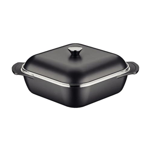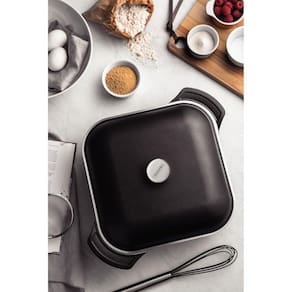 Corpo de alumínio forjado com espessura de 8,0 mm que proporciona cozimento rápido e uniforme. Tampa de alumínio com espessura de 4,5 mm que proporciona cozimento rápido e uniforme. Revestimento interno e externo de antiaderente Starflon High Performance que não gruda, é fácil de limpar, mais durável, não é prejudicial à saúde e é livre de PFOA.Alças em alumínio forjado e pegador de aço inox. É possível assar, cozinhar, fritar, descongelar e até leva-las ao forno sem a tampa para gratinar. Pode ir à máquina de lavar louças, porém, para maior durabilidade do produto, indicamos lavar manualmente.