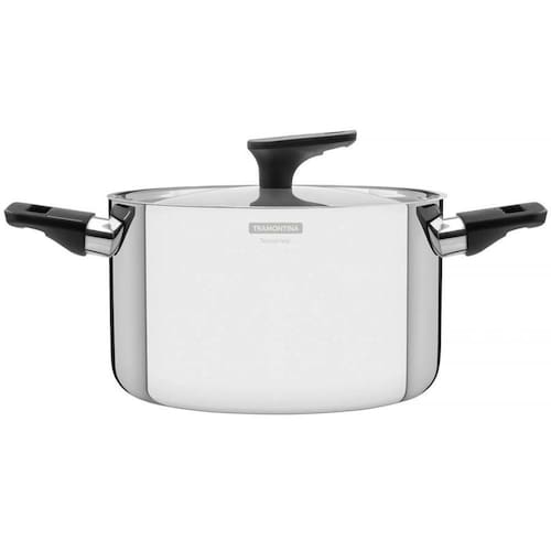 Caçarola Tramontina Grano Baquelite Funda em Aço Inox com Corpo Triplo Tampa e Alças de Baquelite 24 cm 5,8 L Mais saudável: por ser feita de aço inoxidável, a caçarola Tramontina não libera nenhum tipo de resíduo nas suas receitas. Fácil de usar: uma caçarola prática para todas as suas receitas e que faz bonito em qualquer tipo de fogão: gás, elétrico, vitrocerâmico e indução. Ainda possui tampa com saída de vapor e encaixe perfeito. Alças e pegador em baquelite, não aquecem, com protetor de chamas, evitando que queimem quando a chama não estiver centralizada no fundo da caçarola. Mais durável: o inox Tramontina é uma matéria-prima nobre, resistente e que vai fazer bonito por muito mais tempo na cozinha. Economiza tempo e energia: o segredo está no corpo triplo (aço inox + alumínio + aço inox), que distribui o calor uniformemente, proporcionando um cozimento mais rápido. Por isso, você pode manter o fogo baixo durante todo o preparo e, assim, poupar energia. Fácil de limpar: deixar sua caçarola brilhando é simples, você só precisa de água, sabão e uma esponja macia. Se preferir, é só colocar na máquina de lavar. Recomendações de uso Antes do uso, remova as eventuais etiquetas presentes no produto, e em seguida recomendamos lavar. Use uma fonte de calor sempre baixa, para evitar que o alimento grude no fundo da caçarola. O fundo triplo distribui uniformemente o calor, não sendo necessário o fogo alto. E, além disso, você economiza energia. Quando a caçarola for utilizada no fogão a gás, a chama não deve ultrapassar a base da caçarola. No caso de uso de chapa elétrica, a chapa deverá ter diâmetro igual ou inferior ao da caçarola. Não aqueça o alimento colocando uma caçarola ou qualquer utensílio do mesmo diâmetro um sobre o outro. Esse procedimento é perigoso, pois cria vácuo e impossibilita a retirada. Não deixe a caçarola vazia sobre uma fonte de calor. Deixe caçarolas quentes somente em superfícies resistentes ao calor. Sempre dissolva o sal em água fervendo ou com os alimentos, mexendo os ingredientes no início do cozimento. Alguns alimentos que possuem amido, como massa e arroz, poderão deixar manchas na parte interna da caçarola durante o cozimento. Para remover facilmente as manchas, passe um pano umedecido com suco de limão ou vinagre, ou use a pasta Tramontina para polir e remover manchas. Evite deixar alimento na caçarola por muito tempo; o sal também pode provocar manchas e corrosão. Para que a caçarola de aço inox fique sempre bonita e com brilho, recomendamos que seja lavada somente com detergente neutro e esponja. Além disso, nas partes foscas da caçarola pode-se utilizar o lado mais abrasivo da esponja com saponáceo líquido, para remover as manchas mais difíceis. Depois da lavagem, sempre que possível, enxágue a caçarola com água quente e seque-a imediatamente, para que ela mantenha o brilho original, pois o cloro e as substâncias contidas na água podem deixar manchas na caçarola. Nas caçarolas/tampas cujo sistema de fixação utiliza parafuso, com o tempo de uso, ele poderá afrouxar-se. Recomenda-se, por segurança, o reaperto. As alças, pegadores e cabos aquecem durante o cozimento. Aconselhamos o uso de luvas ou pano no manuseio. É necessário cuidado ao manusear o produto, principalmente com alimentos ou líquidos quentes. Para sua segurança, utilize somente até a capacidade máxima indicada no fundo do produto.