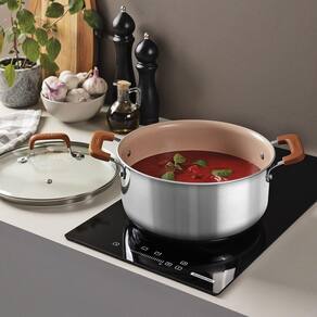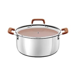 A caçarola Tramontina Romagna em aço inox e alumínio com revestimento interno cerâmico Marfim de 24 centímetros de diâmetro e 5,24 litros, combina robustez e praticidade, sendo ideal para o preparo de grandes receitas. Perfeita para ensopados, massas e carnes, ela é uma excelente escolha para quem adora receber a família ou amigos em casa. Seu revestimento interno cerâmico proporciona um cozimento uniforme e facilita a limpeza. A Tecnologia Biply Induction, que une aço inox e alumínio, torna a caçarola com todos os tipos de fogões, incluindo indução, oferecendo cozimento rápido e uniforme, além de economia de energia e segurança na hora de cozinhar. As alças e pegadores metálicos com proteção de silicone proporcionam maior conforto e segurança durante o manuseio, enquanto o design sofisticado adiciona um toque de modernidade à sua cozinha. A caçarola perfeita para quem valoriza praticidade e qualidade no dia a dia, trazendo elegância para cada refeição!