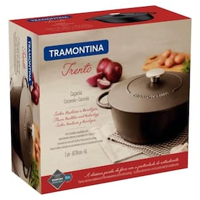 Caçarola Tramontina Trento Antiaderente 28cm A escolha perfeita para deixar um sabor caseiro em todas as suas receitas é a Caçarola em Ferro Fundido Esmaltado 28 cm com atiaderente interno Starflon Excellent Tramontina Trento. Cozinha os alimentos de maneira uniforme e evita que eles grudem em sua superfície. Ainda pode ser levada ao forno para . Mais versartilidade para sua cozinha! Recomendações de Uso: Antes do Uso: Remova eventuais etiquetas, lave interna e externamente usando apenas uma esponja macia, sabão neutro ou detergente líquido. Outros tipos de produtos, como palha de aço, poderão riscar ou prejudicar a peç de Uso:Posicione os cabos dos utensílios voltados ao centro do fogã fogões com grade, centralize a peça e alinhe o cabo com a utilizar em fogões de base lisa, levante a peça para movimentá-la, evitando riscos em seu fogãílios quentes devem estar fora do alcance de crianç produto não pode sofrer modificaçõ do primeiro uso, lave manualmente com esponja macia, sabão ou detergente com pano de secar, unte a área interna com óleo ou gordura e leve ao fogo por um ou dois esfriar e lave utensílio está pronto para uso com ou sem gordura, sempre em fogo baixo ou médio (nunca superior a 260C).Seque totalmente as peças com pano macio e guarde-as sempre em locais secos e arejados, longe de vapor ou qualquer mexer os alimentos use somente utensílios de silicone, nylon ou ferro esmaltado é extremamente resistente, mas pode ser se cair ou bater contra uma superfície dura, portanto evite quedas e impactos, que podem provocar o desprendimento do isto ocorrer, poderá haver a formação de ferrugem na área afetada, não alterando o desempenho do utensí proteger a área danificada, unte com óleo alimentício embebido em papel toalha.Limpeza: Evite choque térmico: não mergulhe o utensílio quente em água utilize produtos abrasivos na deixar queimar alimentos, umedeça a área com água e limpe com esponja e sabão ós a limpeza, aplique uma fina camada de óleo alimentício na borda da peça (corpo e tampa).Para descarte dos produtos e embalagens siga as orientações de reciclagem vigentes. Informações Adicionais: