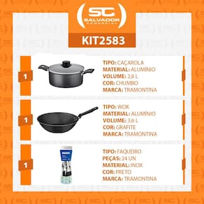 Caçarola Turim Alumínio grafite Antiaderente 2,8L + Faqueiro Ipanema 24pc + Wok Loreto 3,6L