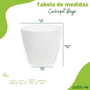 Características Largura: 6 cm Altura: 5,8 cm Peso: 15 gramas Marca: Vasart Furo de drenagem: Sem furo Material: Plástico Polipropileno Ambientes: Interno e externo