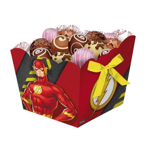 Cachepot Flash C/8 FestColor. Flash o protetor de Central City com seu superpoder de velocidade, capaz de ser mais rápido que a própria luz, agora vai se teletransportar diretamente para sua festa e tornar ainda mais incrível. O cachepot pode ser utilizado como centro de mesa (com balões e guloseimas), e também para servir pipoca, biscoito, docinho e salgadinho.