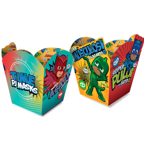 Cachepot PJ Masks C/4 Regina. Conte com esses pequenos e adoráveis super-heróis noturnos que juntos formam os PJ Masks! Corujita, Menino Gato e Lagartixo vão cumprir a missão de divertir a sua festa, desperte o herói interior do seu pequeno. O cachepot pode ser utilizado como centro de mesa (com balões e guloseimas), e também para servir pipoca, biscoito, docinho e salgadinho.
