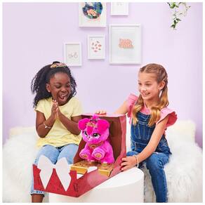 Para iniciar a grande revelação, desembrulhe a camada externa da caixa e puxe a etiqueta para presente. A caixa começará a tremer enquanto seu cachorrinho majestoso abre caminho para fora O painel frontal se abre, revelando qual Present Pets Princess Pup está dentro de Mazie ou Cici Cada Princesa Filhote apresenta uma tiara e coleira brilhantes, detalhes dourados nas orelhas e patas, olhos expressivos e um corpo macio e macio.