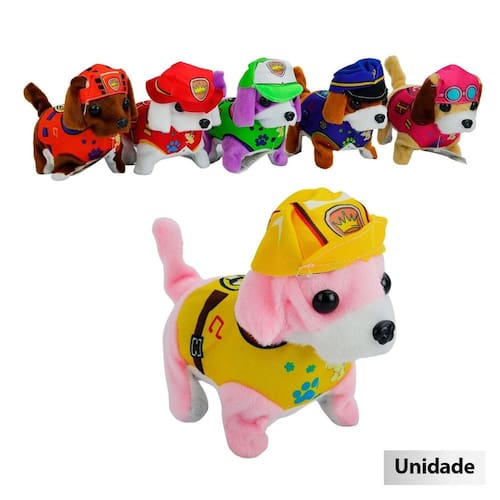 Cachorro à Pilha com SOM Patrulha - Cachorro de plástico com Som e Movimento a Pilha, (O cachorro anda para frente e para trás);\n- Utiliza 2 Pilhas "AA" (Não Inclusas);\nEspecificações:\nMarca : P&D\nTipo de material : Plástico\nCores ou Estampa :\nDimensões do Produto : 14 X 17 X 7 CM\nDimensões da Embalagem : 14 X 17 X 7 CM\nPeso Bruto (Gramas) : 0.120