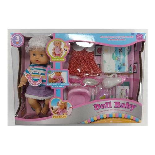 Adorável boneca com vestido e chapéu. A boneca cria um RPG realista para mães e filhos. Inclui: mamadeira, fralda, penico, pente, secadora, lenços umedecidos e um vestido. Com esta linda boneca, sua garotinha pode se divertir com os gestos e ruídos produzidos pela mesma caixa. Medidas: 46x32x10