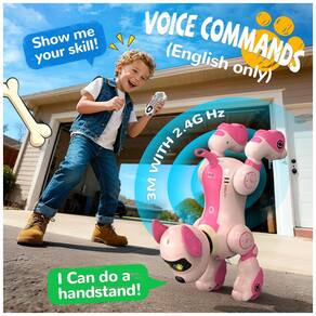 O cachorro robô Anysun rosa é um pet eletrônico programável com controle remoto, indicado para crianças a partir de 8 anos, que combina três modos de interação: controle remoto, comandos de voz em inglês e sensores de toque no corpo. O brinquedo aceita comandos direcionais e aciona reações “fofas” ao toque, simulando respostas de um cão de estimação em ambiente interno.