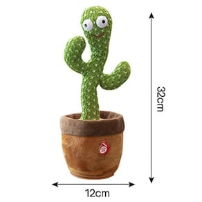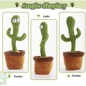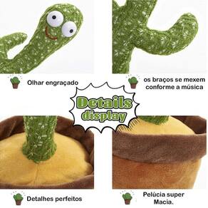 Cacto de pelúcia com seu olhar muito engraçado ele dança, gira, mexe os braços, toca música, acende luzes e repete sua fala. Tecido de malha com efeito tridimensional, macio, confortável, seguro e funcional Ele imita qualquer palavra que disser perto dele, possui luzes coloridas que chamam toda a atenção das crianças. Toca 120 canções diferentes.