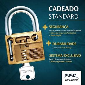 O Cadeado Standard Papaiz, é produzido em latão maciço , haste de aço cementada e cromada, possui 2 chaves em latão niqueladas. Para conservação melhor de o produto lubrificar com óleo mineral quando necessário.