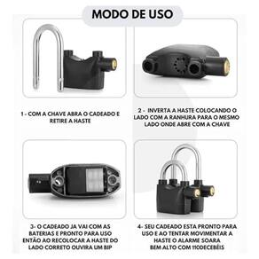 Cadeado com alarme antifurto prova de água lock Cadeado com Alarme Sonoro. Ideal para Proteção de Portões, Garagens, Motocicletas e Mais Características Principais: Alarme de Alta Potência: Alarme sonoro de 110dB que dispara com movimento ou impacto, proporcionando segurança adicional. Material de Alta Resistência: Manilha em aço fundido de 10 mm e corpo em liga de alumínio para resistência a corrosão e durabilidade. Versatilidade: Pode ser com ou sem a função de alarme, adaptando-se às suas necessidades. Funcionamento Inteligente: 1 toque curto para armar 3 toques curtos para informar que irá disparar o alarme se não parar de mexer ou forçar o cadeado vai disparar a sirene de 110 decibéis. O alarme desarma sozinho, caso não mexam mais com o cadeado. Se o intruso continuar mexendo no cadeado ele continua disparando. Alarme de 2 tons Bi P De Aviso e Sirene de 110 DB. Não depende de instalação pois funciona com baterias - acompanha 6 baterias reserva e 6 baterias já instaladas no produto baterias de longa duração. Lembrando o cadeado vai desarmado, para ativar basta retirar a alça do cadeado e inverter a posição da haste Especificações Técnicas: Resistente à Água e ao Tempo: Ideal para uso externo em diversas condições climáticas. Sensor Dual: Detecta choque e movimento, aumentando a segurança. Acompanha Baterias e Chaves: 12 baterias LR44 6 instaladas e 6 reservas e 3 chaves de corte a laser exclusivas. Dimensões e Peso: Tamanho total - 12.5cm x 9cm x 3cm; Fechadura - 8cm x 6cm x 1cm; Peso - 330g. Itens Inclusos: 1 Cadeado com Alarme Sonoro. 1 Kit Baterias 3 Chaves Marca: Não Informado Ean: 7895312496442