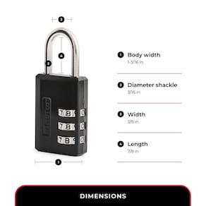 - A fechadura de combinação pequena é construída com um corpo de metal sólido, acabamento preto e manilha de aço