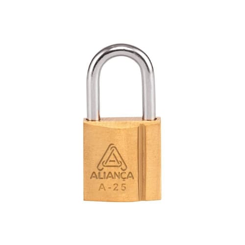 Com acabamento em LT (latão), o cadeado Aliança Metalúrgica oferece proteção contra corrosão e um visual refinado.