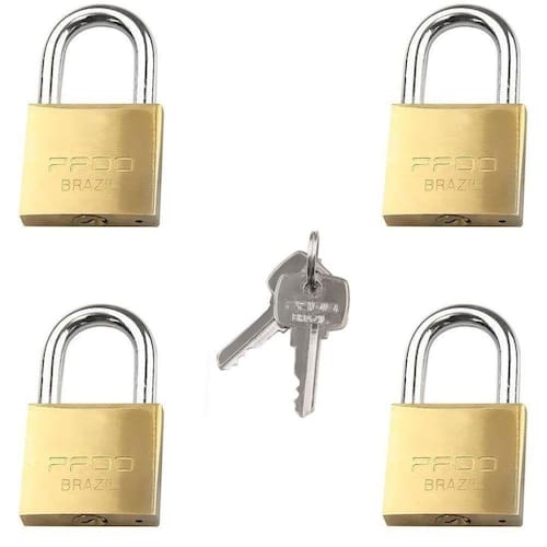 Cadeado 30mm Com Mesmo Segredo 4 Unidades Os cadeados da Pado possuem o corpo em latão maciço e haste em aço inoxidável, para proporcionar maior segurança e tranquilidade para você e sua família. Itens resistentes desenvolvidos em diversas dimensões para utilização em diversos tipos de fecho. Este modelo possui 4 cadeados com mesmo segredo, e 4 chaves iguais. Tipo de utilização: ideal para correntes, portões, janelas e outros ambientes que se deseja controlar o acesso. Nível de segurança: médio. Cor: dourado. Exclusões de garantia: para defeitos provenientes de uso indevido, tentativa de arrombamento ou violação, mudanças de tonalidade devido à exposição a intempéries. Composição: Corpo em latão maciço, haste em aço. Conteúdo da embalagem: 4 Cadeados Marca: Pado