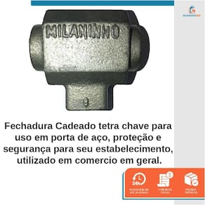 O cadeado para porta de aço Milaninho Tetra da Milano Cadeados é uma opção de segurança resistente e confiável, projetada para reforçar a proteção de portas de aço. Fabricado com materiais duráveis e tecnologia Tetra de quatro pontos de travamento, oferece alta resistência a arrombamentos. Sua construção robusta e resistência à corrosão garantem durabilidade em diversas condições. A operação suave e a chave Tetra proporcionam praticidade, tornando-o ideal para residências, comércios e indústrias que buscam segurança eficaz e duradoura.Cilindro: só fecha utilizando a chave.Barrica: peça parafusada na porta.Cone: peça chumbada no piso.Baioneta: peça de engate girada no cone e introduzida na barrica.Fechamento do conjunto, somente usando a chave.Especificações técnicas:Material: Aço ForjadoPeso 1,30kgCódigo: 500Modelo: MilaninhoTipo de Chaves: TetraRef. 3031047Marca: Milano Cadeados Marca: Milano Cadeados