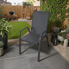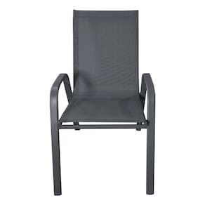 Esta cadeira possui encosto e assento em tecido Textilene, conhecido por sua resistencia e conforto. A tonalidade cinza escuro adiciona uma sensacao de requinte, enquanto os bracos garantem um suporte adicional. Apesar de nao ser dobravel ou reclinavel, a cadeira e empilhavel, facilitando o armazenamento e otimizando o espaco. Com capacidade para suportar ate 110 Kg, esta cadeira e uma combinacao perfeita de funcionalidade e design.