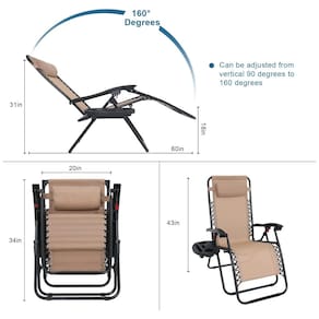 Resistente e durável suporta até 330 libras , 150 kg. Uma cadeira antigravitacional feita de tecido de poliéster durável e estrutura de tubo de aço revestida a pó é resistente à ferrugem. O bungee duplo fornece suporte extra. Confortável e conveniente Bandeja lateral destacável com suporte para copo embutido para bebidas, telefones e livros. O tecido respirável mantém as costas mais frias. O travesseiro removível do apoio de cabeça torna a cabeça e a lombar mais confortáveis. Ajuste multicângulo Simplesmente use um dedo para pressionar , pressionar o botão de travamento para encontrar uma posição adequada. Sente se em pé a 90 graus para conversar ou reclinar completamente em 160 graus para relaxar. Segurança Os pés antiderrapantes o tornam mais onde quer que você esteja aproveitando seu tempo livre, como quintal, pátio, jardim, piscina e praia. Design portátil Três segundos para dobrar e desdobrar. O design leve e dobrável facilita a adição à viagem de sua família ao parque, praia ou ao próximo evento esportivo de seu filho Marca: Não Informado