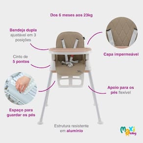 Cadeira De Alimentação Infantil Compacta 3 em 1 Harmony Rosa Maxi Baby A Cadeira de Alimentação 3 em 1 Harmony Maxi Baby foi desenvolvida para proporcionar praticidade, segurança e conforto para os pequenos durante as refeições e momentos de lazer. Com um design multifuncional, transformando-se de cadeira Alta para cadeira de encaixe até cadeirinha infantil. Modo Cadeira Alta: O tradicional Cadeirão de Alimentação, neste estágio a cadeira fica mais alta facilitando o acesso para os pais na hora da introdução alimentar da criança, indicado para crianças a partir de 6 meses até 15kgs. Modo Cadeira de Encaixe: Permite adaptar a cadeira de alimentação em cadeiras de mesa comuns com a ajuda de cintos de segurança fixados sobre a base da cadeira de mesa. Permitindo que a criança participe de todos os momentos entre família nas horas das refeições. Indicado para crianças a partir de 12 meses até 23kgs. Modo Cadeira de Reforço: Ideal para crianças maiores até 23kgs, podendo ser utilizada nas horas das refeições e como cadeirinha infantil comum para leitura, descanso e atividades adaptando-se às necessidades do dia a dia. Apoio de pés removível no modo Cadeira Alta e Reforço, cinto de segurança de 5 pontos entrepernas, mantém a criança segura em todas as posições, enquanto a base fixa com travamento e pés antiderrapante garante total estabilidade. Pensando na praticidade dos pais, a Cadeira Harmony conta com uma capa de PVC impermeável e uma bandeja de jantar dupla removível ajustável em três posições, permite uma limpeza rápida e pode ser lavada na máquina de lavar louças, tornando o dia a dia muito mais prático. Os materiais utilizados são resistentes a manchas, evitando acúmulo de sujeira e prolongando a durabilidade do produto. Outro grande diferencial é a facilidade de montagem e transporte. Leve e compacta, a cadeira pode ser desmontada sem necessidade de ferramentas, sendo montada em cerca de 10 minutos. Possui compartimento interno para armazenamento das peças quando desmontada. Cabe em qualquer cantinho da casa, levar para a casa de familiares ou até mesmo em viagens. Fabricada com materiais de alta qualidade, sua estrutura em alumínio e plásticos resistentes PP e ABS garante durabilidade. Produto certificado pelo INMETRO garantindo mais segurança e tranquilidade para os pais. Principais Características: - Idade recomendada: A partir de 6 meses - Modo de uso 3 em 1: Pode ser utilizada como Cadeira Alta, Cadeira de Encaixe de Mesa, Cadeira de Reforço - Cinto de segurança de 5 pontos - Bandeja removível ajustável em 3 três posições com prato de jantar duplo - Pés Antiderrapante removível - Capa Impermeável de fácil remoção - Apoio de pés removível - Possui compartimento interno para armazenamento das peças quando desmontada - Se ajusta em diversas fases da criança - Fácil de limpar: Laváveis na máquina de lavar louça. - Material resistente a manchas - Leve e portátil: Fácil de desmontar e transportar - Montagem rápida e sem ferramentas - Peso máximo suportado: 23kgs - Design ergonômico: Proporciona conforto e segurança para a criança durante as refeições. - Estrutura resistente: Fabricada com alumínio, PP e ABS para maior durabilidade e segurança. - Produto Certificado pelo INMETRO Especificações Técnicas: - Conteúdo da Embalagem: 1 Cadeira de Alimentação 3 em 1 Harmony + Manual de Instruções. - Material/ Composição: Alumínio, PP, ABS e Tecido em Poliéster - Dimensões do Produto Montado 67,0 x 60,0 x 90,0cm aprox. - Peso: 3,700kg - : 90 Dias Contra Defeito de Fabricação pelo Fabricante - Certificação pelo INMETRO Registro nº 3380/2025 - Código do Fabricante: 21861 - EAN: 7899403218616 - Marca: Maxi Baby Fotos ilustrativas Cores e modelos podem variar conforme a fabricação.