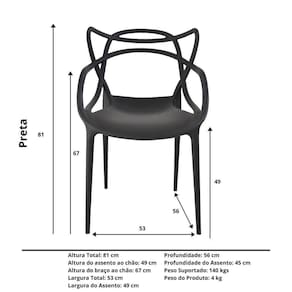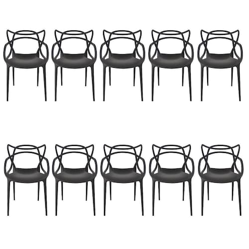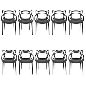 Cadeira Allegra Masters Preta - kit com 10 Este kit é composto por 10 unidades da Cadeira Allegra na cor Preta.A Cadeira Allegra é uma criação do designer Phillipe Starck em parceria com Eugeni Quitllet, e foi inspirada em três cadeiras ícones de design: a Series 7 (do designer Arne Jacobs), a Eiffel Eames (do casal Charles e Ray Eames) e a Tulipa (de Eero Saarinen). Ela foi projetada unindo esses 3 designs em uma única peça, através de linhas que se cruzam para criar um modelo exuberante e confortável que se destaca em qualquer ambiente! É um item de design e decoração descontraído e versátil, fazendo jus ao seu nome.Devido ao seu design ergonômico, a Cadeira Allegra se destaca entre as demais por acomodar de forma confortável as curvas naturais do corpo tornando esse modelo extremamente aconchegante. Ideal para sua sala de jantar, de estar, home office, varandas e sacadas, fica perfeita também em projetos de área gourmet, quiosques e ambientes abertos pois a sua proteção UV permite que ela fique exposta ao sol sem perder a cor ou se deteriorar. Devido à sua versatilidade ela também se adequa perfeitamente à ambientes comerciais, seja na sala de reuniões da empresa, em escritórios, clínicas, consultórios, hotéis de luxo ou qualquer estabelecimento que busque por um design diferenciado e com toques de requinte.Fabricada em polipropileno com fibra de vidro, sua resistência é incomparável, podendo suportar até 140kg, comprovada pelo selo de certificação de qualidade do INMETRO.Leve e dinâmica, a Cadeira Allegra é de fácil transporte e manuseio, já chega no seu endereço cuidadosamente embalada e pronta para uso, não necessita montagem, dispensando o serviço de montador profissional. Empilhável, ela vai facilitar o seu dia durante a organização do ambiente e durante a limpeza. Para limpar sua Cadeira Allegra é muito simples: basta usar um pano umedecido com sabão neutro e pronto! Seu material facilita a limpeza, não mancha e garante durabilidade e praticidade para o seu dia a dia.Não nos responsabilizamos por eventuais danos ao manusear o material em elevadores, transporte pela escada ou elevações pelo lado de fora de prédios.É indispensável que, no endereço indicado, haja um representante legal (comprador ou pessoa anteriormente indicada), maior de 18 anos, e portando documento de identificação para receber, conferir a mercadoria e assinar o protocolo.As cores do produto podem variar entre a imagem de exibição e o item físico. Características da Cadeira Allegra- Kit com 10 unidades- Design descontraído e versátil- Ergonômica- Se encaixa em qualquer ambiente da sua casa- Fica bem em ambiente comercial- Feita em propileno e fibra de vidro- Proteção UV: pode ficar exposta ao sol- Fácil de transportar e manusear- Resistente e durável- Certificada pelo INMETRO- Empilhável- Suporta 140Kg- Praticidade na limpeza e manutenção Medidas da Cadeira Allegra- Altura: 81 cm- Altura do assento: 49 cm- Altura do braço ao chão: 67 cm- Largura: 51 cm- Profundidade: 56 cm- Peso suportado: 140 kg- Peso do Produto: 4 kg- Peso total do kit: 40 kg Indicações de Uso:- Não utilizar produtos químicos e abrasivos para limpeza- Limpar com pano umedecido e sabão neutro para melhor conservação- Não sentar sobre as cadeiras se estiverem empilhadas