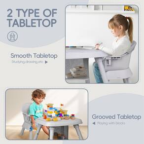 - A mesa conversível possui um tampo de mesa de dois lados. Um lado é perfeito para ler, desenhar e aprender, enquanto o outro é ideal para atividades de blocos de construção. Um espaço de armazenamento embutido na parte inferior mantém os itens organizados e acessíveis.