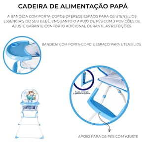 Cadeira alta de alimentação infantil com porta copo papá azul avião Cadeira alta de alimentação infantil papá azul avião Código: hc15d Com um revestimento plastificado, a papá garante uma limpeza rápida e fácil, tornando o momento das refeições mais tranquilo para todos. Equipada com proteção lateral e um cinto de segurança de cinco pontos, a papá oferece um ambiente seguro e confortável para o seu bebê durante as refeições. Com uma estrutura em aço e pintura epóxi de linha premium, a papá combina durabilidade com um design elegante, garantindo que ela se adapte perfeitamente a qualquer ambiente. A bandeja com porta-copos oferece espaço para os utensílios essenciais do seu bebê, enquanto o apoio de pés com três posições de ajuste garante conforto adicional durante as refeições. Com uma trava de segurança, a papá oferece tranquilidade aos pais, garantindo que a cadeira permaneça estável durante o uso. A papá é projetada para facilitar o transporte e o armazenamento, sendo fácil de desmontar quando necessário. Principais características: Possui revestimento plastificado de fácil limpeza; Proteção lateral; Possui cinto de segurança 5 pontos Estrutura em aço, pintura epóxi linha premium Bandeja com porta-copos Apoio de pés com 3 posições de ajuste Trava de segurança Fácil desmontagem Capacidade máxima 15 kg Registro do produto no inmetro: 003348/2023 Dimensões: - medida da cadeira aberta: 100x43x74 axlxp : 12 meses direto com o fabricante Marca: Não Informado Ean: 7908488102885