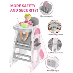 - ?Design ergonômico?O design ergonômico inclui um encosto ajustável de três posições e um apoio para os pés de duas posições, permitindo que você encontre os ângulos de alimentação e descanso mais confortáveis para o seu filho. O arnês de segurança de 5 pontos oferece segurança adicional, tornando esta cadeira alta para crianças uma opção segura à medida que seu bebê cresce. Também é uma excelente escolha como cadeira alta para crianças pequenas