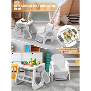 - Conjunto de mesa e cadeira frente e verso. Esta cadeira alta para bebês pode ser facilmente convertida em um conjunto de mesa e cadeira para aprender e brincar do seu bebê. O lado liso permite que os bebês rabisquem livremente e libertem sua criatividade. O outro lado pode ser utilizado como uma mesa de blocos para brincadeiras criativas com blocos. Retire a tábua da mesa e coloque areia dentro, para que o bebê possa experimentar a diversão das pilhas de areia em casa. Contém uma caixa de armazenamento que pode armazenar facilmente pincéis e blocos de construção do bebê.